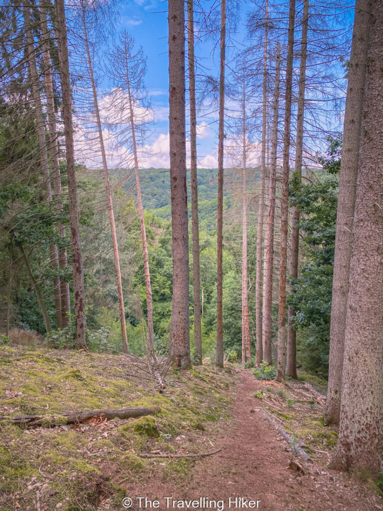 Soon enough, you will reach the forest and the trail will start to descend towards the Ourthe River. Halfway throughout your descend, you will see that there is a trail that goes to the left slightly uphill. This is not part of the route, but I recommend you take this small detour to get some epic views over the Ourthe.