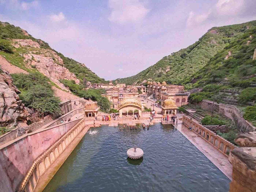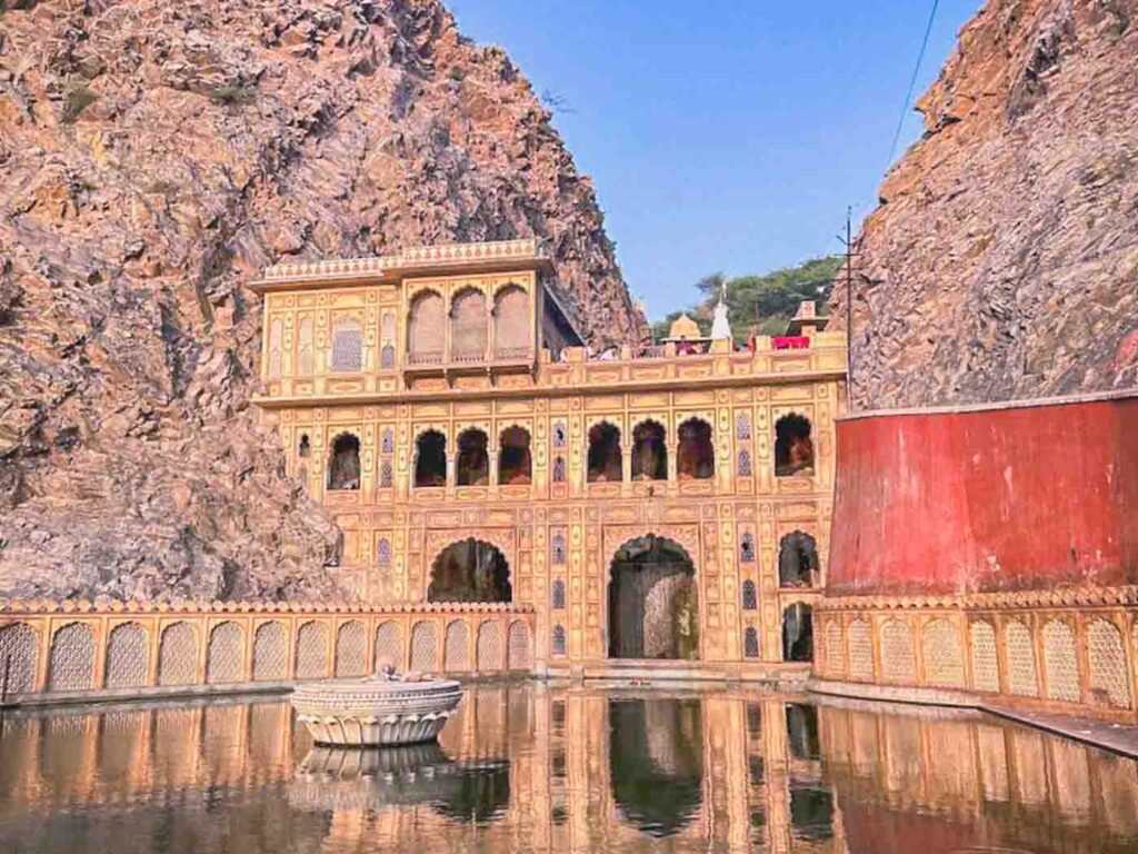 The temple complex dates back several centuries and is built around a natural water source that never dries up. Inside you will find a series of sacred water tanks, known as kunds, where pilgrims come to bathe. The most important of these is the Galta Kund, believed to have holy properties. Surrounding the pools are temples, pavilions, and carved structures with pink sandstone details that blend beautifully into the landscape.