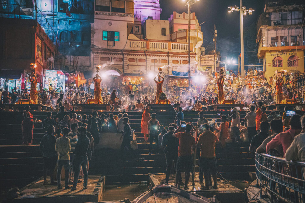 As the sun sets, priests dressed in traditional saffron robes takes their places on raised platforms facing the river. They perform a choreograph series of offerings using large brass lamps, incense, conch shells, and rhythmic chants. The air fills with the sound of bells, the scent of flowers and sandalwood, and the glow of hundreds of small oil lamps floating on the water.