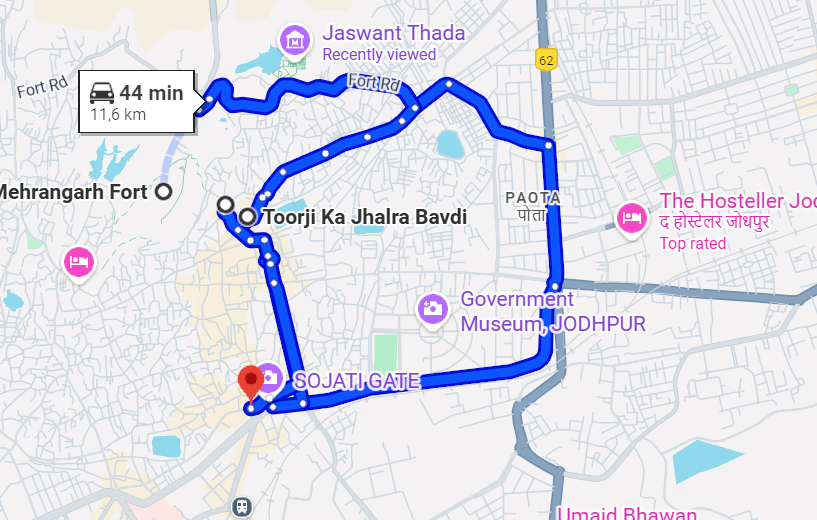 Route: From Hotel to Mehrangarh Fortress and around Jodhpur (Distance: 10,5 km; Time: 35 minutes)